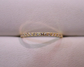 またまた 200706/13 またまたフロイラインのオーダーをいただきました。 本社スタッフのお姉さんのオーダー♪ マリッジリングと重ね着けできるし・・・♡と旦那様におねだりされていました。 マリッジリングはシンプルな甲丸リングに ダイヤモンドを1石留めたもの。 真反対には 結び目にブルーダイヤモンドを留めたリボン🎀が描かれる予定です。 そんなかわいらしいマリッジリングにもぴったり合いそうです♪ オオハラでした。