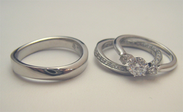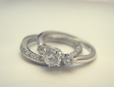 エイミーをアレンジ2 200912/06 前回と同じく aimieを少しアレンジしたエンゲージリングをオーダーいただきました。 同じaimieのアレンジでも 今回は腕のダイヤとミル打ちをなくしてシンプルに。 とてもすっきりとした 現代的な印象になりました。 脇石の5本爪が効いています。 オリジナルのaimieと 今回のリングと 前回のaimieのアレンジと。 少しづつ違うと 印象がずいぶん変わります。 マリッジリングはメビウス。 フルエターナルのメビウスと重ねると いっそう華やか。 オオハラでした。
