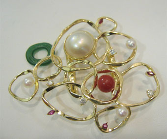 お手持ちのルースを全部使った華やかな帯留めをつくって欲しいとオーダーがありました。