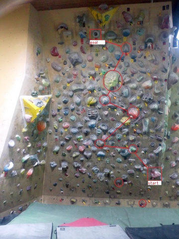 これは 赤丸のところだけを使って(手も足も)ゴールにたどりつく課題。
