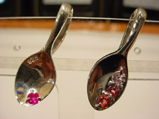 右はお客様のオーダーでピンク系の石がグラデーションで3石留まっているホワイトゴールドのスプーンです。