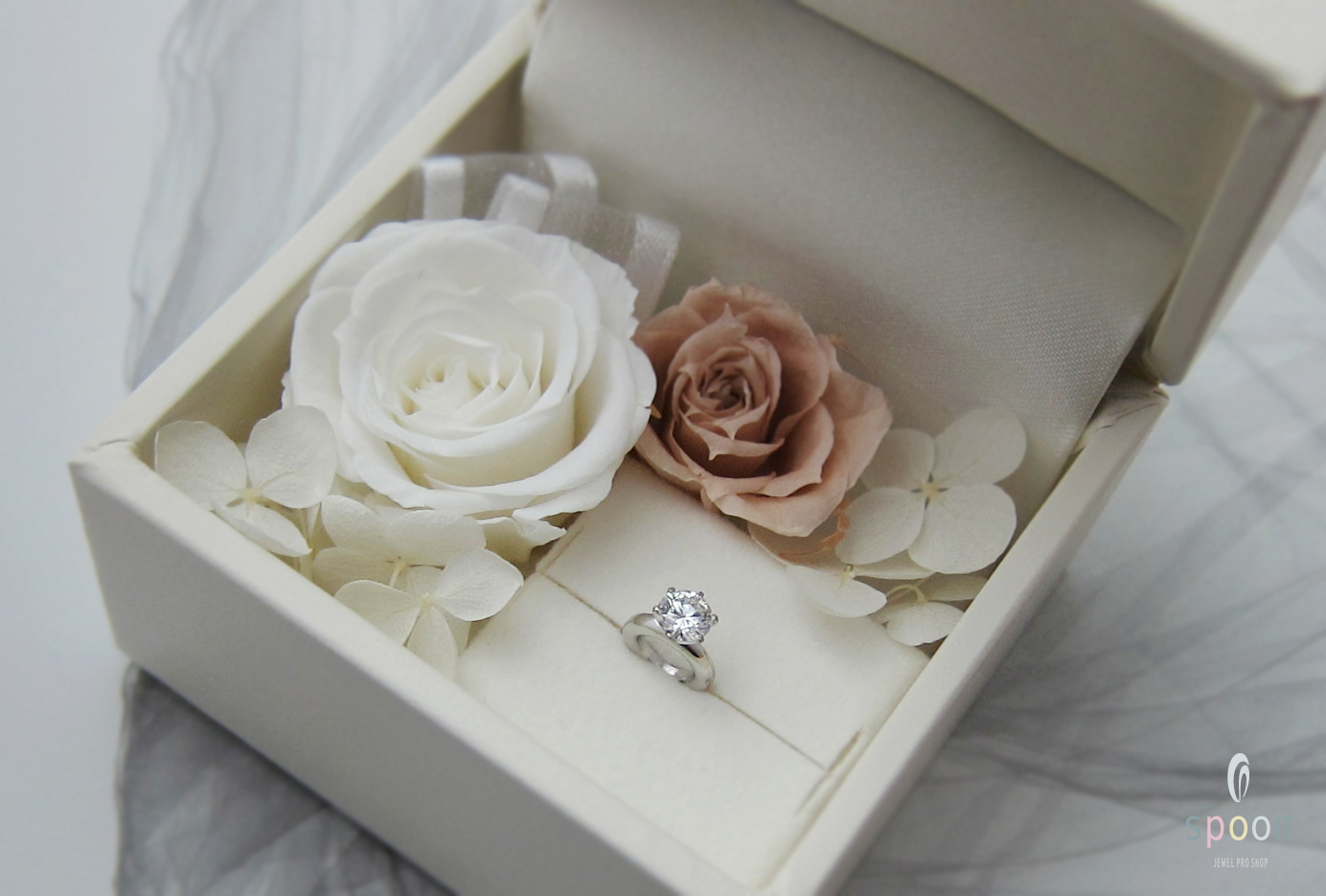 spoonのホームページ「プロポーズ応援」を見て、男性がお一人でご来店。プロポーズしたい日が迫っていたので、大急ぎで加工させていただきました。ミニリングには選んでいただいたきれいなダイヤモンドがキラキラと輝いていました。