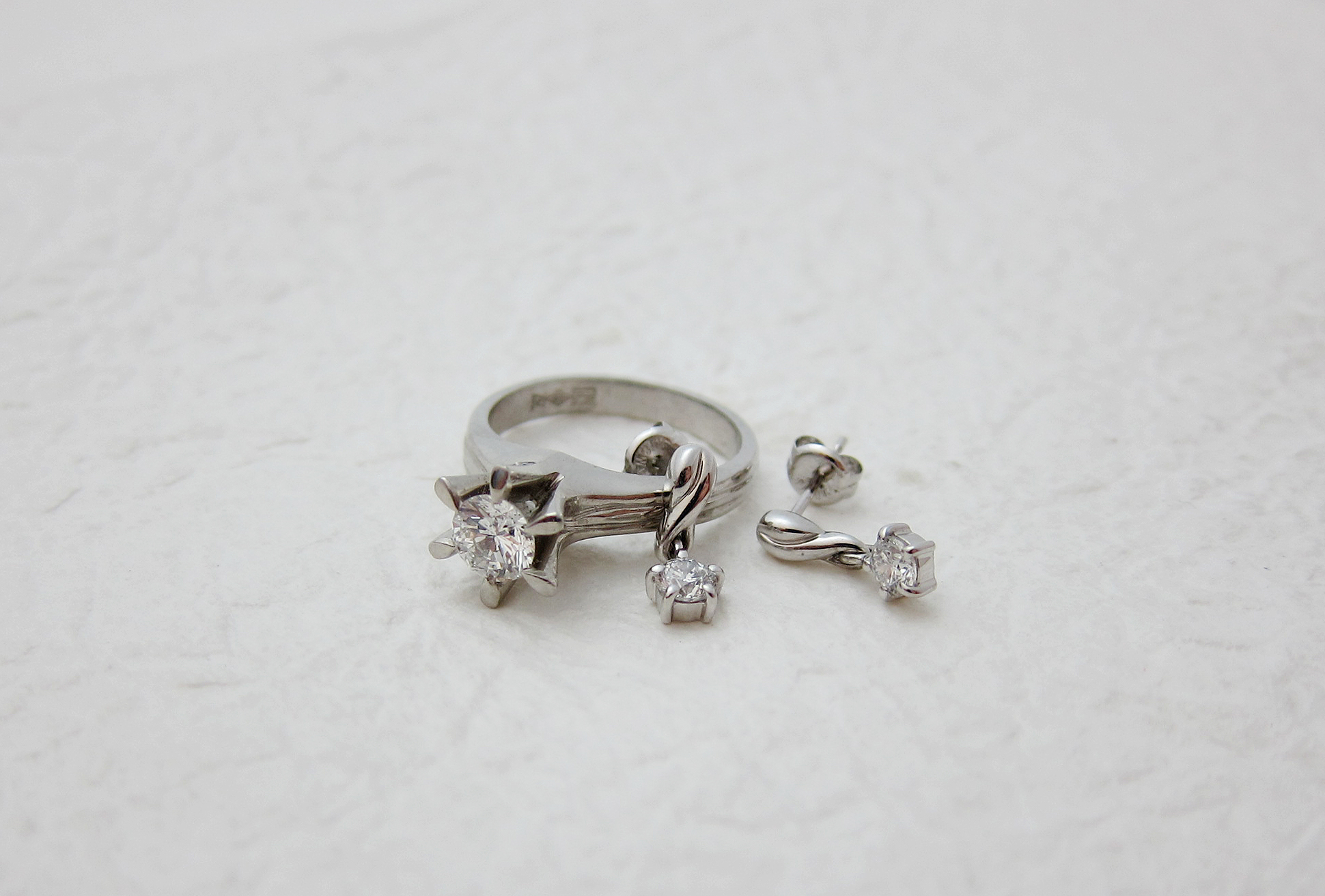 お母様から譲り受けられたダイヤを中央に、ピアスのダイヤは両脇に並べました。ダイヤに接するアーム部分は少し細くシェイプさせて、すっきり見えるようにしました。