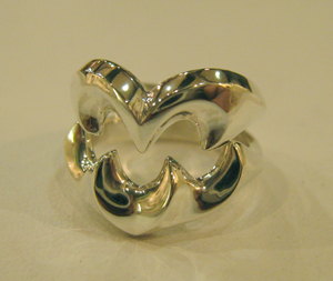 完成のちょっと前 200803/24 マンデーミヤタです。 3月18日のワックスリングが完成 と言いたいところですがそのちょっと前です。 面のエッジがあるのですが、 形を捉えやすくするために残しておいたもので、 デザインには無いのです。 なのでエッジを丸くするのですが、これはこれでかっこよいと思い とりあえず写真を残しました。 上が女性で下が男性のリングです。 少しハートが判りますか?