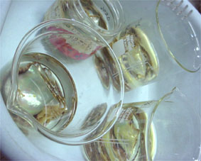 真珠の母貝が何かの液につけられています・・・