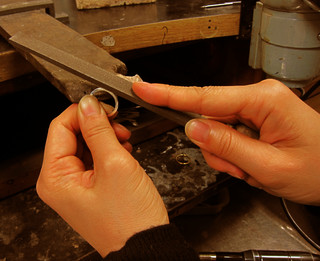削って形をつくる道具”やすり”。ジュエリー制作の中で一番使う道具かもしれません。目の粗いやすりを使い形をつくり、目の細かいやすりに持ち替えて、粗いやすり目をきれいにします。