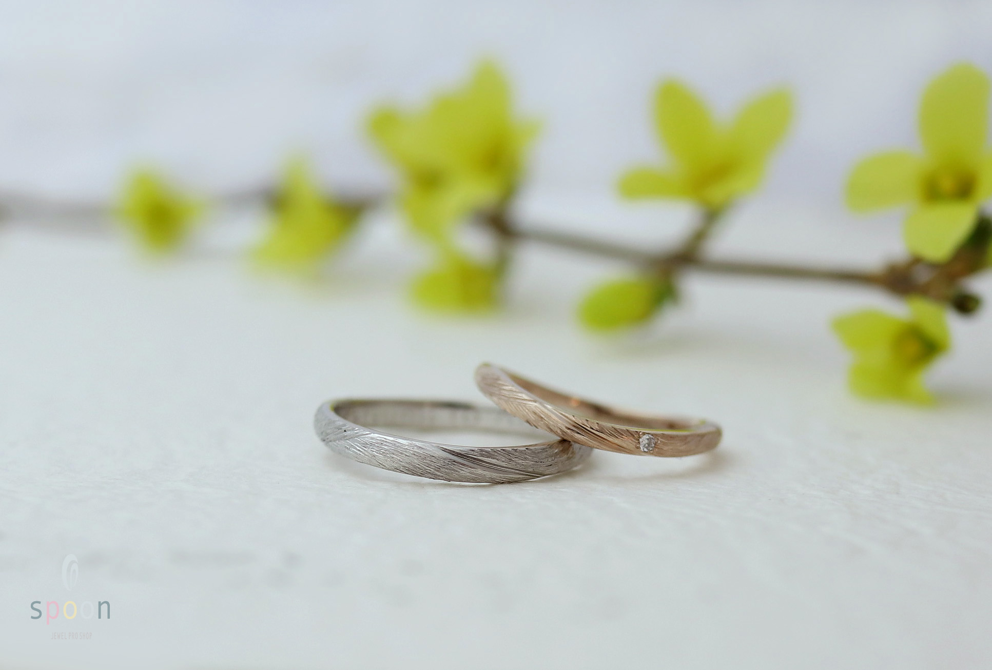 3月に結婚式を挙げられたお二人。「小枝(こえだ)」のテクスチャの入ったマリッジリングのオーダーをいただきました。