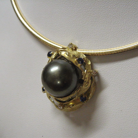 黒蝶真珠を使って イエローゴールドとサファイア・ダイヤのペンダントのオーダーをいただきました。